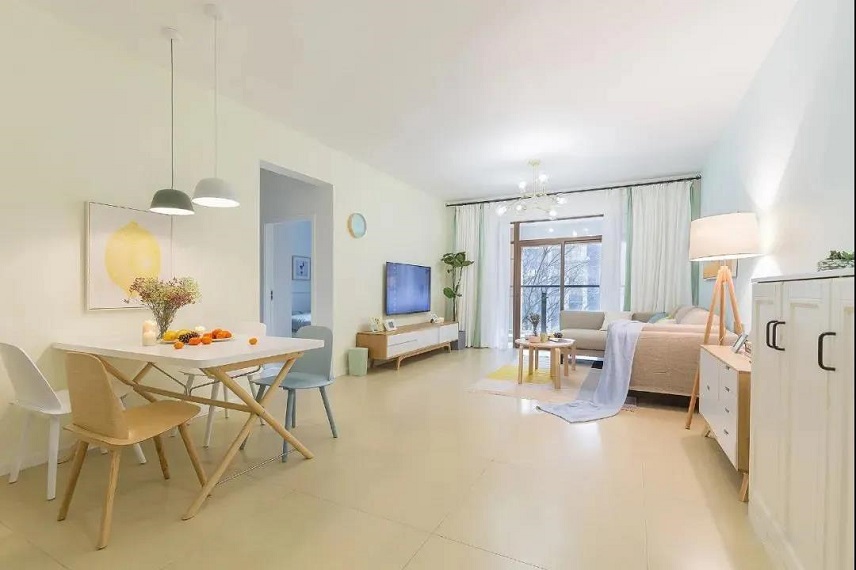 ▲ 原木色餐桌摆放白色郁金香,香薰蜡烛和玫瑰金吊灯点亮空间,给温暖的餐厅平添了一份时尚气息。